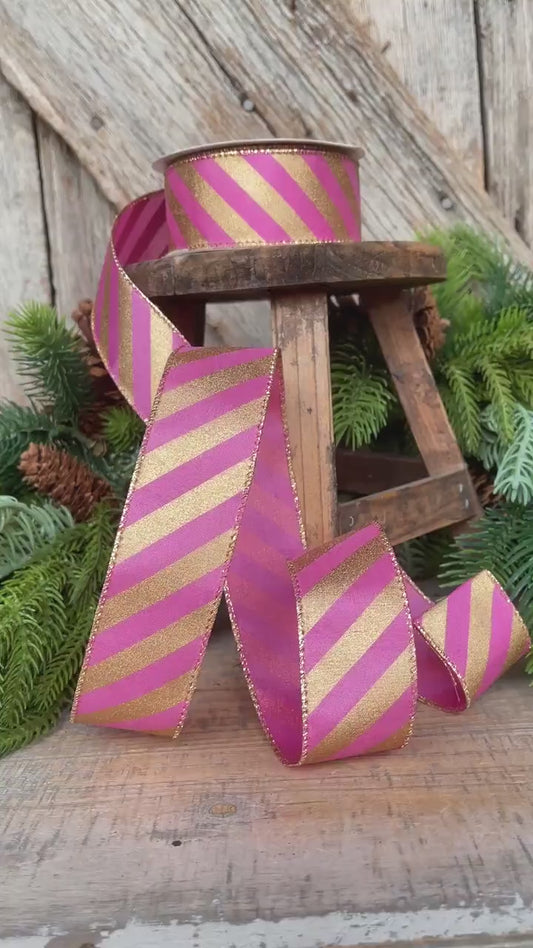 1.5" Pink Gold Ribbon, Pink & Gold Diagonal Stripe Ribbon, CHristmas Ribbon