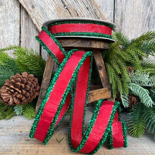 1" Red & Green Tinsel Ribbon, Christmas Ribbon, Farrisilk ribbon