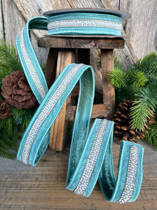 1" Teal Velvet with jewel and pearl stripe, Teal Christmas Ribbon, Designer RIbbon