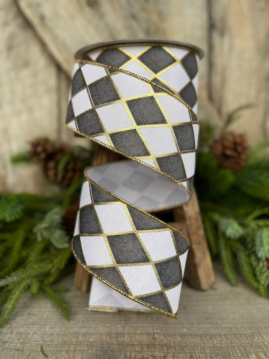 2.5" Black White Antique Diamonds Ribbon, Farrisilk Ribbon, Harlequin Ribbon