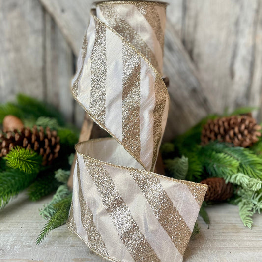 4" Platinum Diagonal Stripe Ribbon, Champagne Gold 4 inch ribbon, christmas ribbon