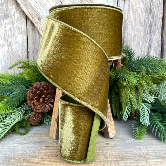 4" Olive Green Velvet Ribbon, Farrisilk Ribbon, Wired Ribbon