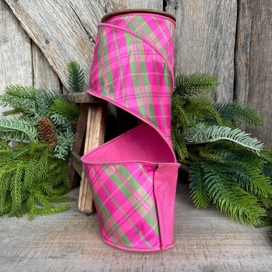 4" Pink and Green Bias Plaid RIbbon, Preppy Ribbon, Bubblegum Pink Plaid Ribbon