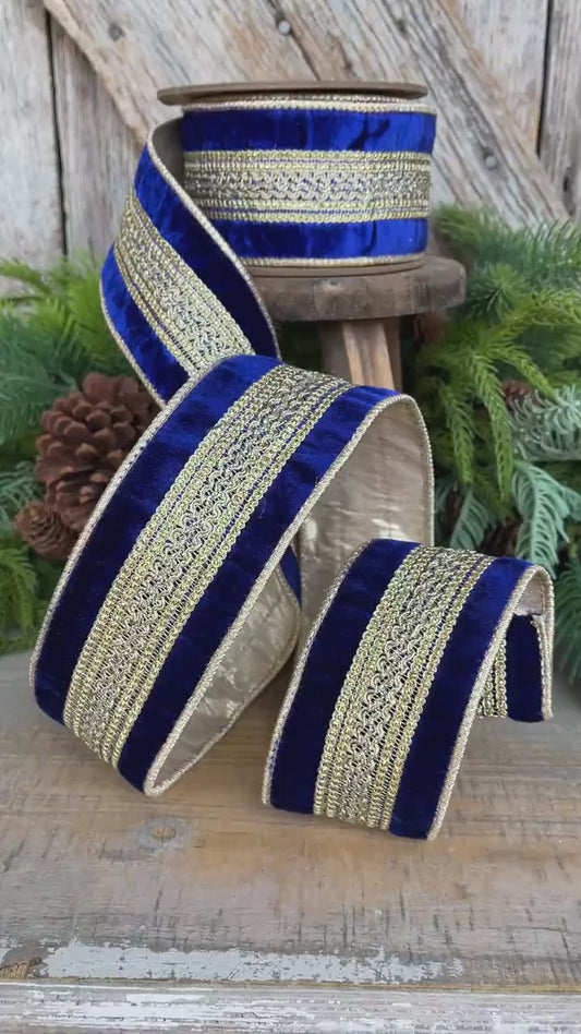 2.5" Blue and Gold Trim Ribbon, Royal Blue Ribbon, Wired Ribbon