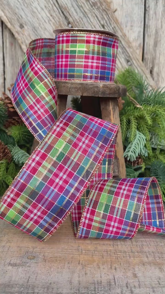 2.5" Pink and Green Plaid RIbbon, Christmas Ribbon, Bubblegum Pink Plaid Ribbon