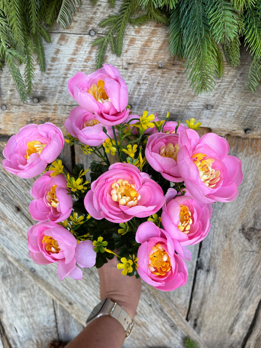 20" Pink Ranuculus Bush, Pink Yellow Floral Bush, Artificial Floral Bush