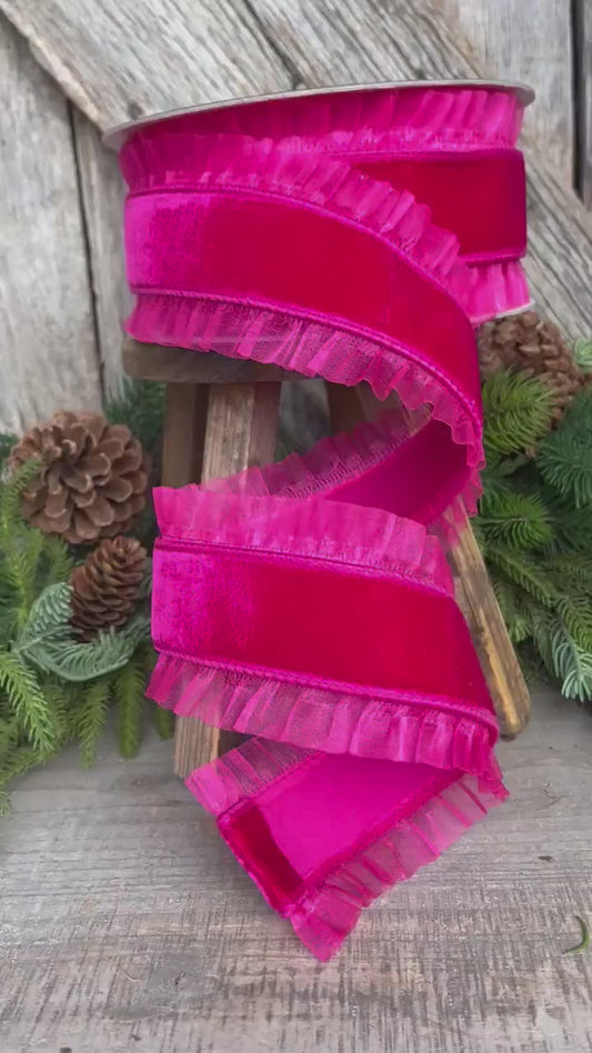 3" Hot Pink Ruffle Ribbon, Farrisilk Ribbon, Pink Christmas RIbbon