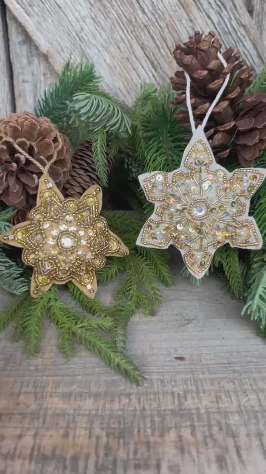 Set of 2 Gold Embroidered Ornaments, 4" Gold Ornaments, Star Ornaments