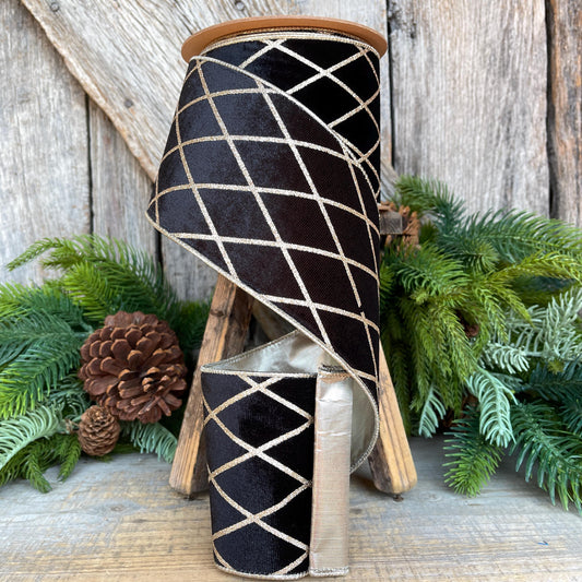 Black Velvet Wired Ribbon, Black Gold Lattice Ribbon Christmas Tree & Holiday Decor, 4" x 10yds