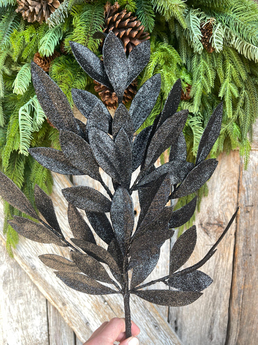 23" Black Bay Leaf Glitter Spray, Black Glitter Spray, Christmas Leaf Spray