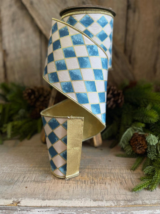 4" Harlequin ribbon, Blue and White Jester Ribbon, Harlequin RIbbon