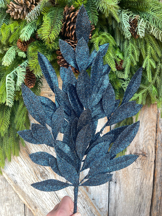 23" Navy Blue Bay Leaf Glitter Spray, Burgundy Blue Spray, Christmas Leaf Spray