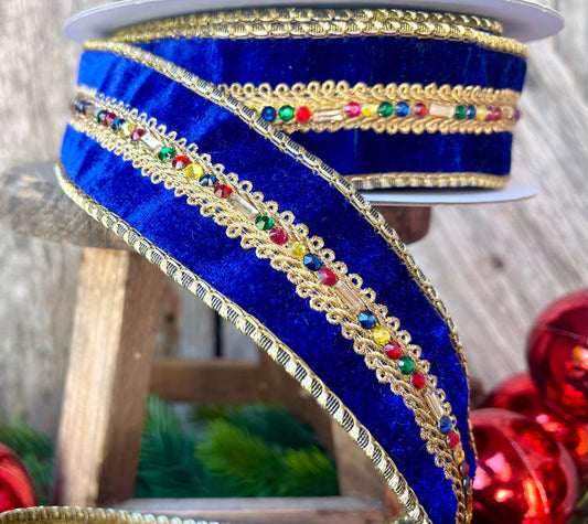 Royal Blue Velvet Jeweled Ribbon, Mutli colored Jeweled Ribbon, Christmas Ribbon