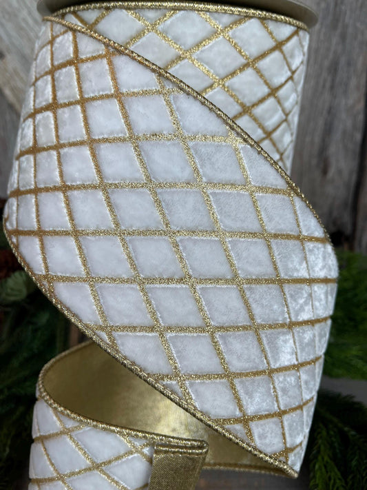 4" Ivory Velvet Metallic Diamonds Ribbon, Farrisilk Ribbon, Ivory and Gold Velvet