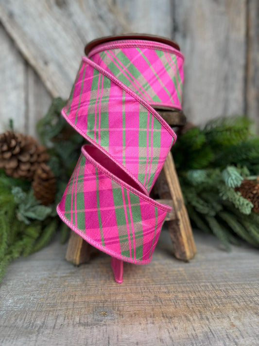 2.5" Pink and Green Plaid RIbbon, Christmas Ribbon, Bubblegum Pink Plaid Ribbon