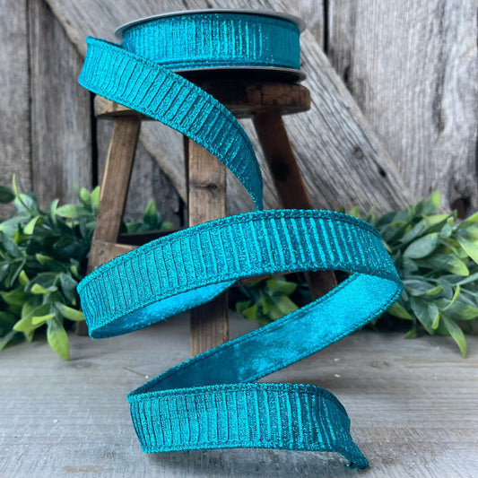 1" Turquoise Pleated Metallic Ribbon, Teal Ribbbon, Farrisilk Ribbon