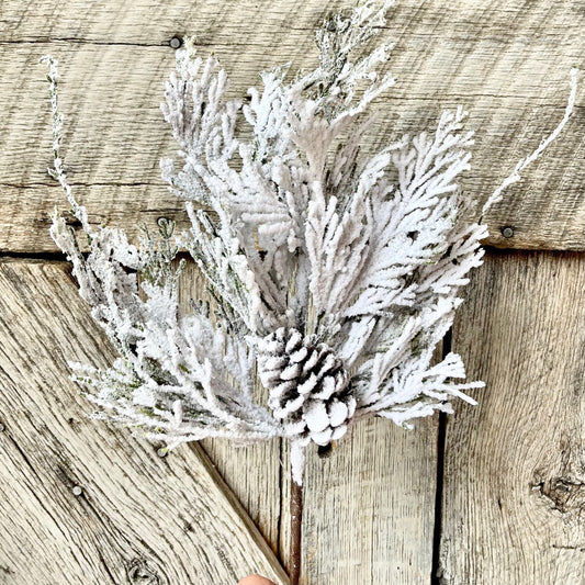 18" Snow Cedar Pinecone Spray, Flocked Pine Stem, Flocked Greenery