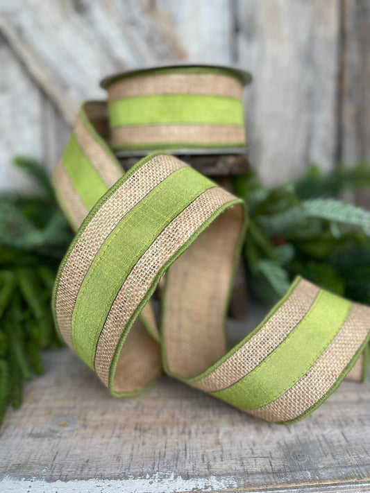 2.5" Green Burlap Border Ribbon, Farrisilk Ribbon, Wired Ribbon