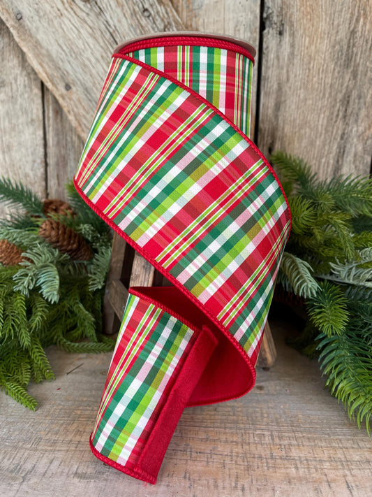 4" Jolly Plaid Ribbon, Farrisilk Ribbon, Red Green Plaid Ribbon