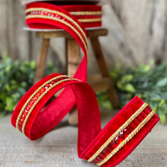 1.5" REd Gemstones, Farrisilk, REd Jeweled RIbbon