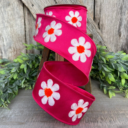 2.5" Hot Pink Daisy Ribbon, Farrisilk Ribbon, Spring Ribbon
