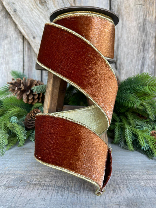 2.5” Bronze Wired Velvet Ribbon, 5 yards, Wired ribbon