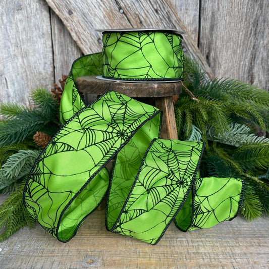 Lime Green Spider Web Ribbon - Wired Halloween Decor, 2.5"