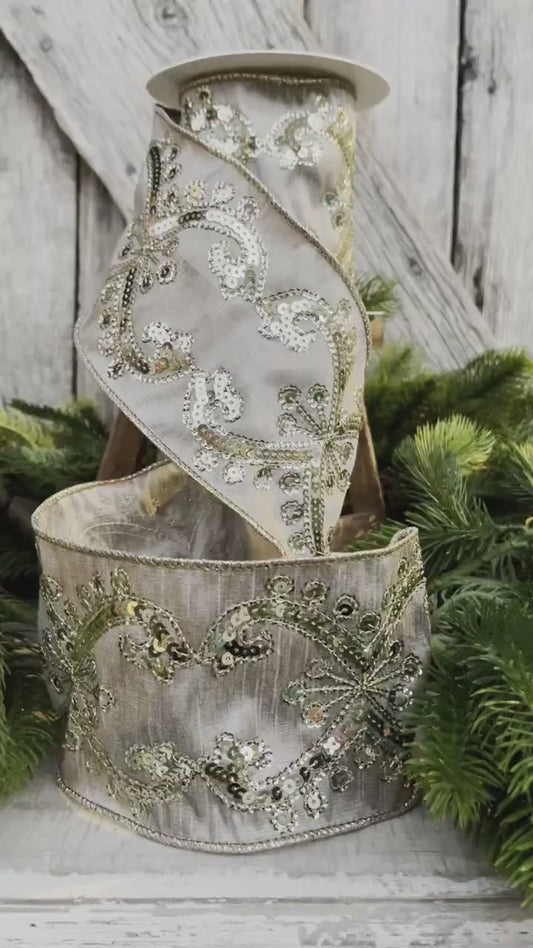 4" Champagne Gold Sequin Ribbon, 4 inch Wired Christmas Ribbon, Platinum Gold Sequin Ribbon