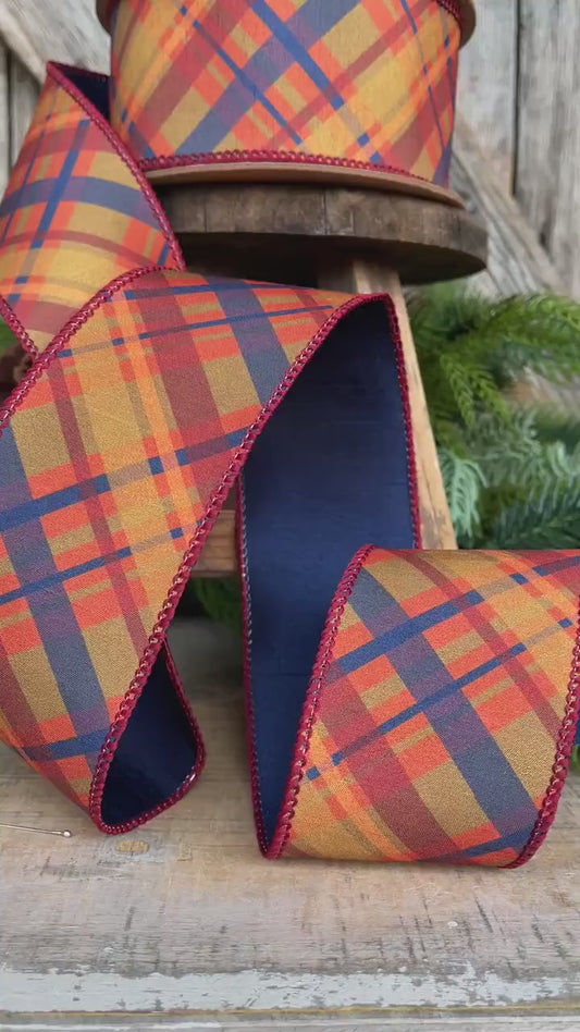Fall Plaid Wired Ribbon 2.5": Navy Blue, Orange, Yellow