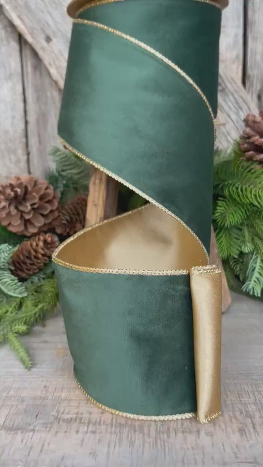 4" Green Velvet Ribbon, Green & Gold Velvet Ribbon, Christmas RIbbon