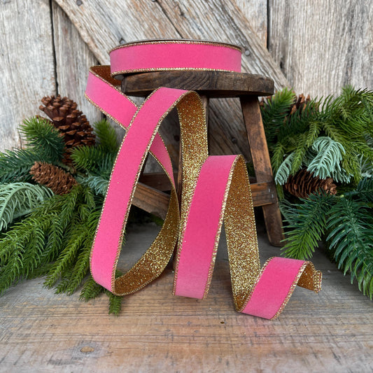 Bubblegum Pink & Gold Wired Ribbon: Farrisilk 1" Gold Gleam