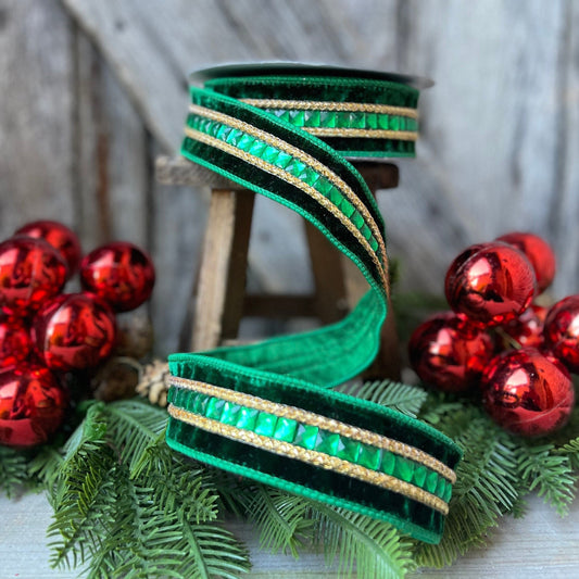 Green Emeral Cut Gemstones Ribbon, 1.5" Emerald velvet jeweled ribbon, Christmas Ribbon