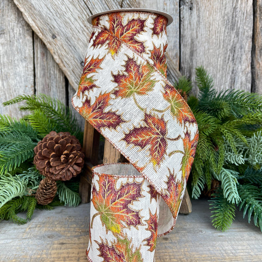 Burlap Fall Leaves Ribbon: 4" Autumn Wired Ribbon, 4" x 10yds