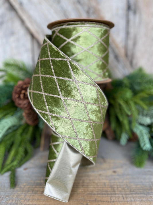 Moss Green Velvet Wired Ribbon, Green Gold Lattice Ribbon Christmas Tree & Holiday Decor, 4" x 10yds