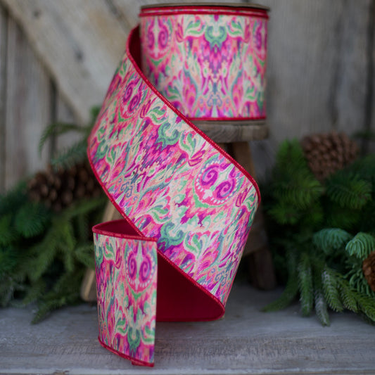 4" Pink Green Ikat Ribbon, Farrisilk Ribbon, Pink Lime Green Floral Ribbon