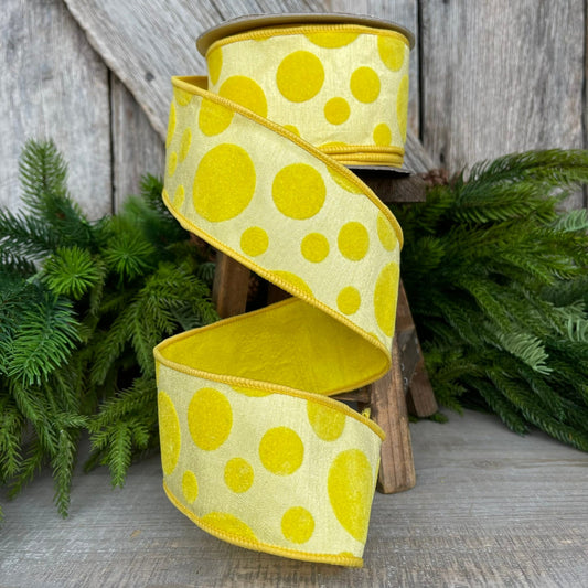 2.5" Yellow Retro Dot, Farrisilk Ribbon, Flocked Ribbon,Spring Summer Ribbon,Wired RIbbon,Designer Ribbon