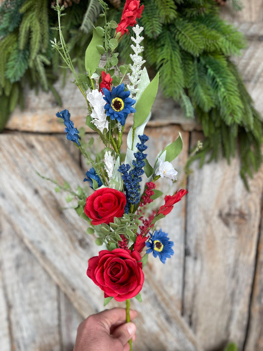 25" Patriotic Rose Spray, Artificial Floral Bush, Red White Blue Floral