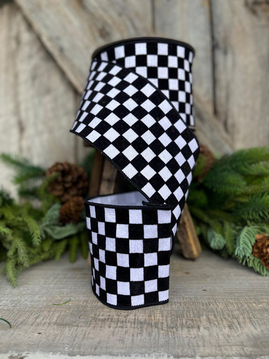4" Black and White Retro Checks Ribbon, Farrisilk Ribbon, Flocked Ribbon,Halloween Ribbon