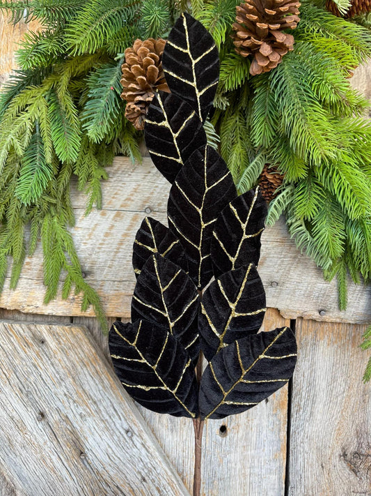 27" Black Velvet Leaf Spray, Black Gold Leaf Spray, Black Floral Spray