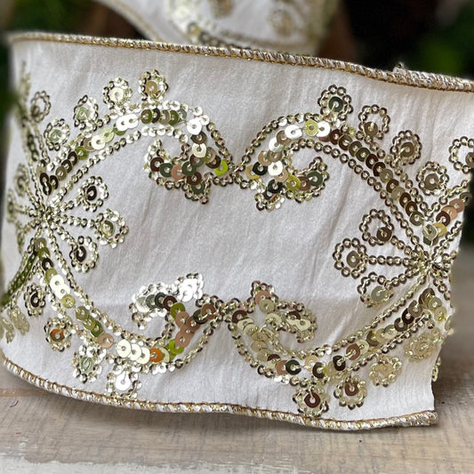 Ivory Gold Sequin Ribbon, 4 inch Wired Christmas Ribbon, Ivory and Gold Sequin Ribbon