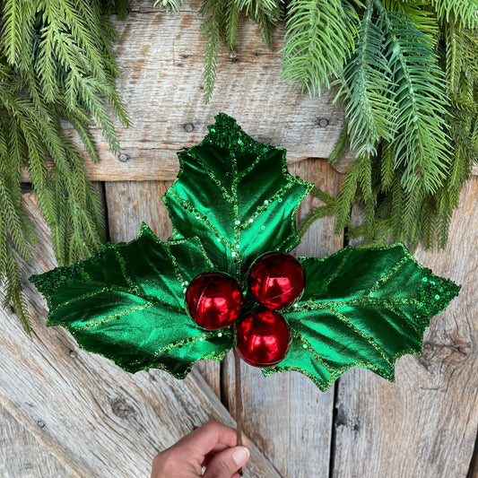 19" Green Red Holly Leaf Spray, Christmas Picks Stems, Holly Leaf Decor