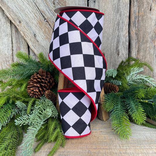 4" Harlequin ribbon, Black and White Jester Ribbon, Black White Red RIbbon