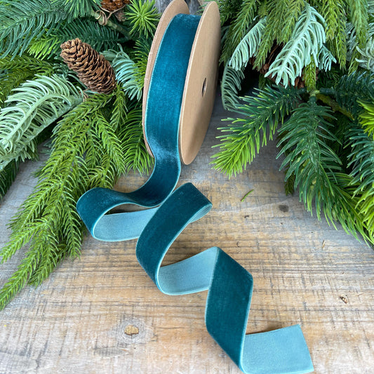 1" Teal Unwired Velvet Ribbon, Christmas Bow Ribbon, Peacock Velvet Ribbon