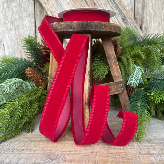 7/8" Red Velvet Ribbon, Deep Red Ribbon, Flocked Ribbon