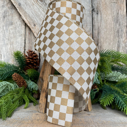 4" Gold Check Ribbon, Christmas Ribbon, Gold Ribbon
