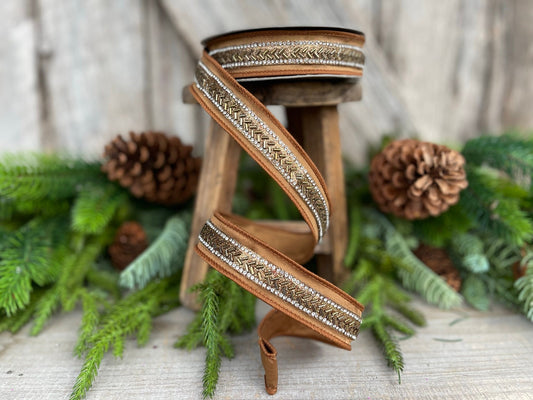 1" Pecan Beaded Baguette RIbbon, Farrisilk Ribbon, Brown Wired RIbbon