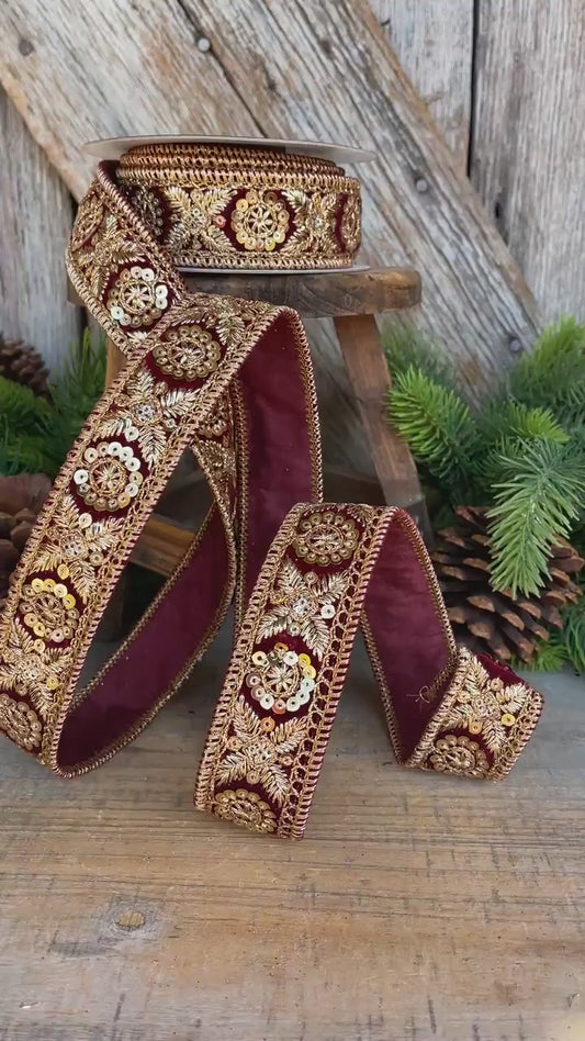 1.5" Burgundy Gold Sequin Ribbon, Christmas Ribbon, Burgundy Ribbon for Tree