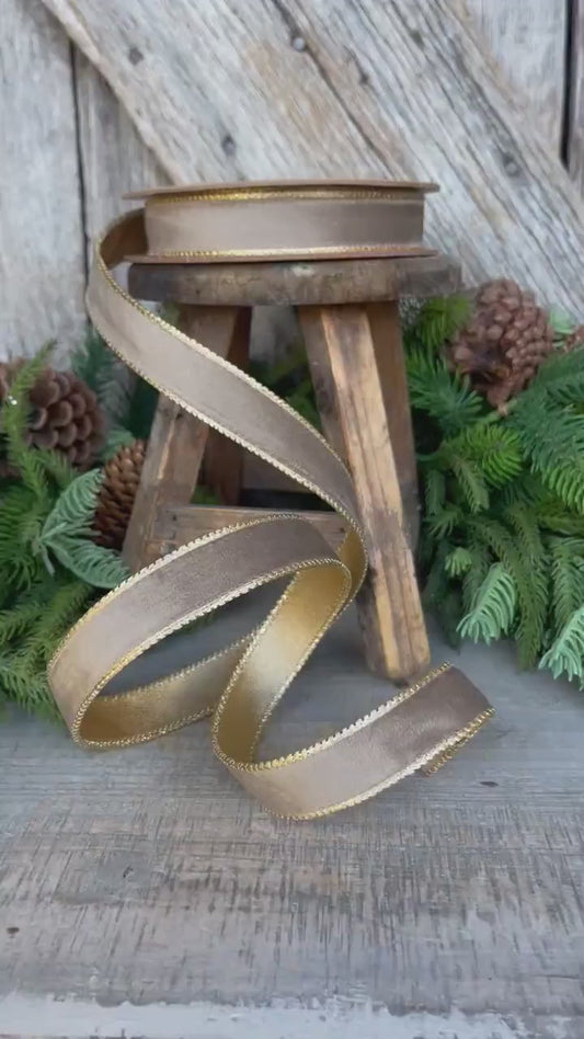 1" Mink Brown Velvet RIbbon, Wired Ribbon, Champagne Gold Velvet Ribbon