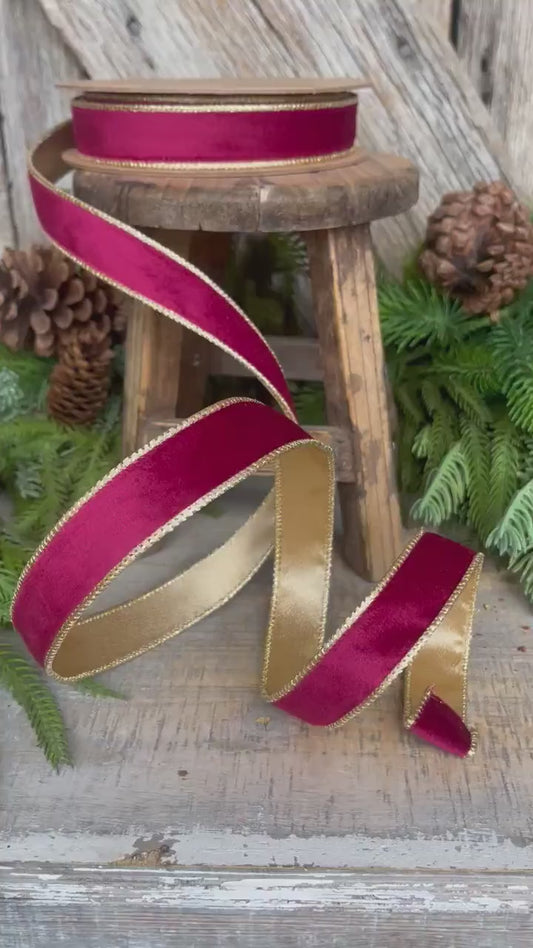 1" Burgundy Gold Velvet Ribbon, Burgundy Velvet Ribbon, Christmas RIbbon