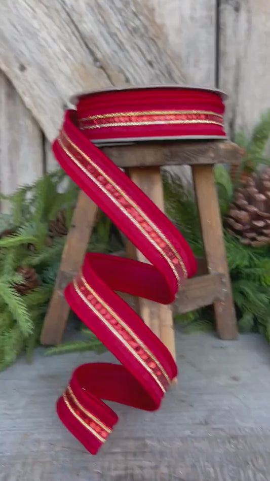 3/4" Red Velvet Luster Wired Ribbon, Farrisilk Ribbon, Velvet Ribbon